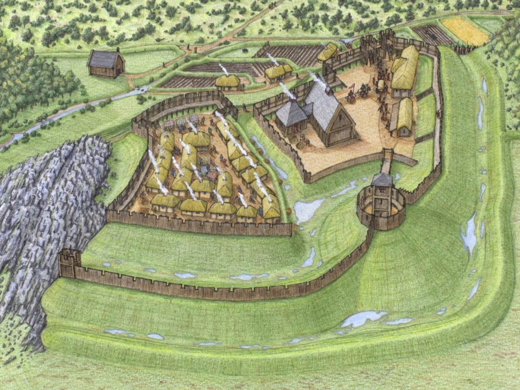 Mae tystiolaeth bod y dref yn cynnwys adeiladau pren o ddau gyfnod gwahanol; un wedi'i adeiladu â physt ac un arall gyda fframwaith yn gorffwys ar drawstiau.